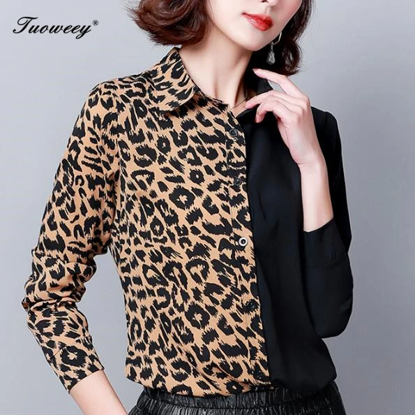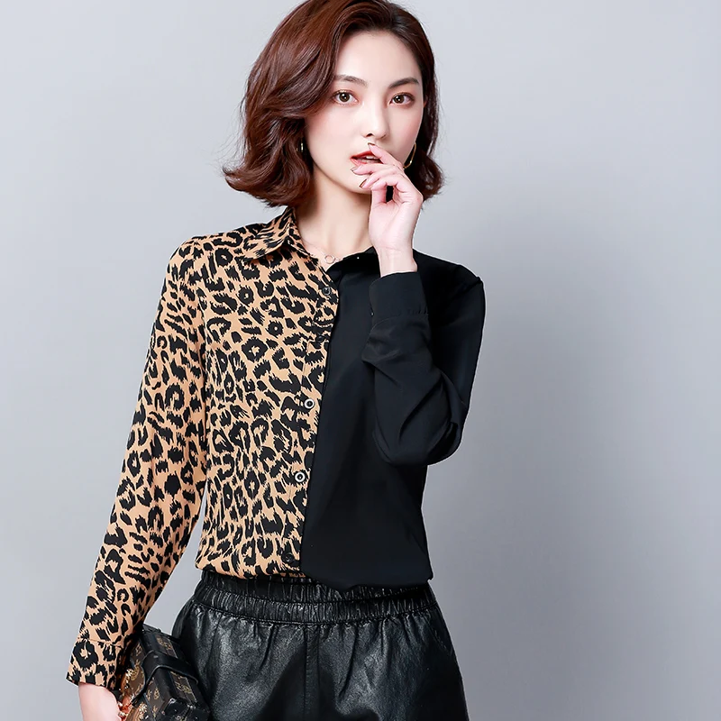 Finest plus size 4XL Chiffon patchwork Blouse Long Sleeve Sexy Leopard Print Blouse Lady Office Shirt Tuni