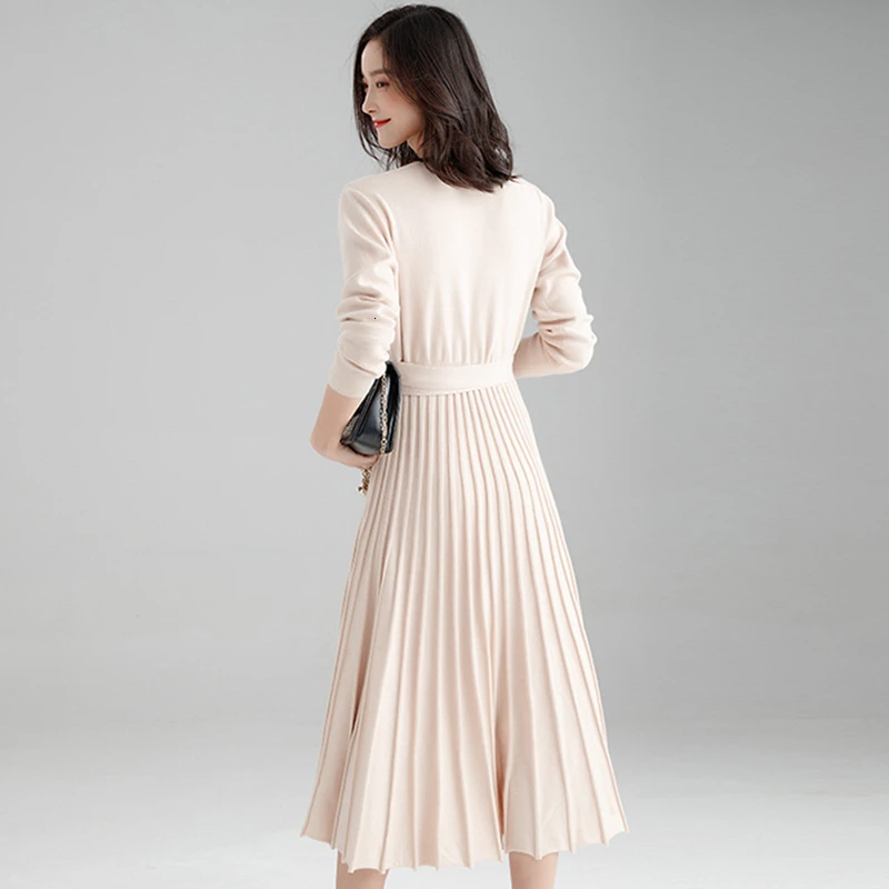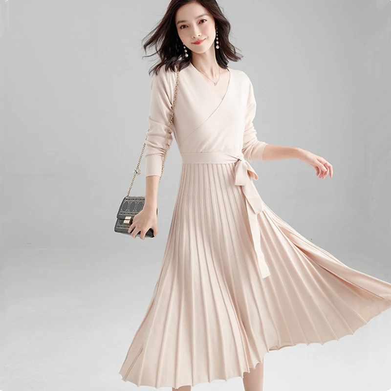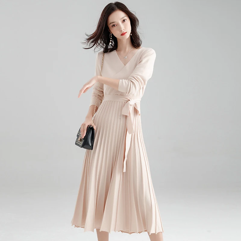 wonderful Autumn Winter Woman Dress V-neck Wrap Sweater Dress Elegant Pleated Long Dress